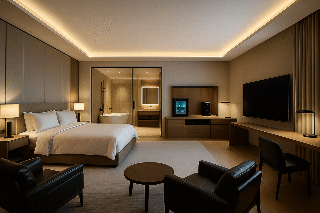 Com 65 m², a Premium Suite é a opção ideal para executivos de alto nível que valorizam exclusividade e requinte em suas estadias corporativas